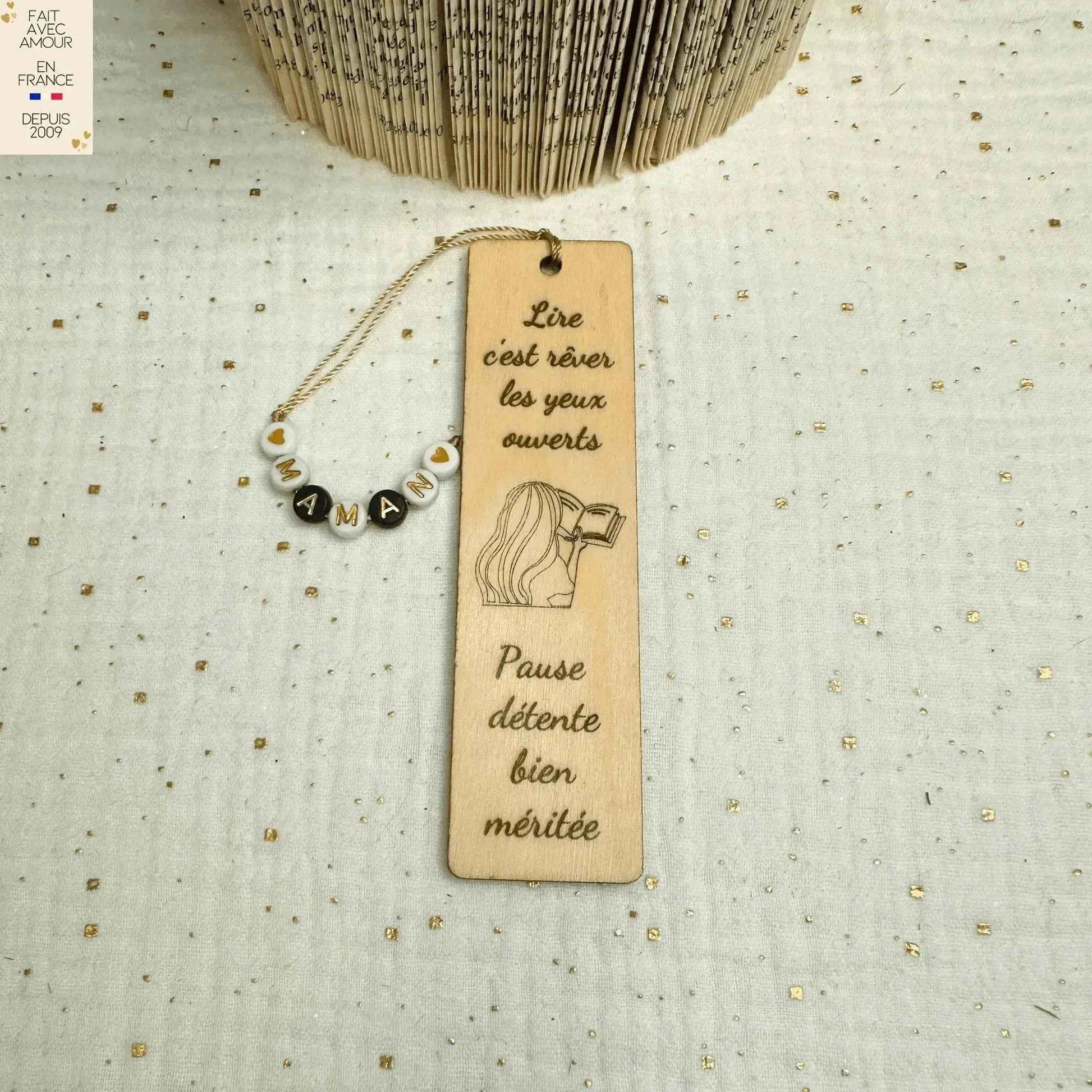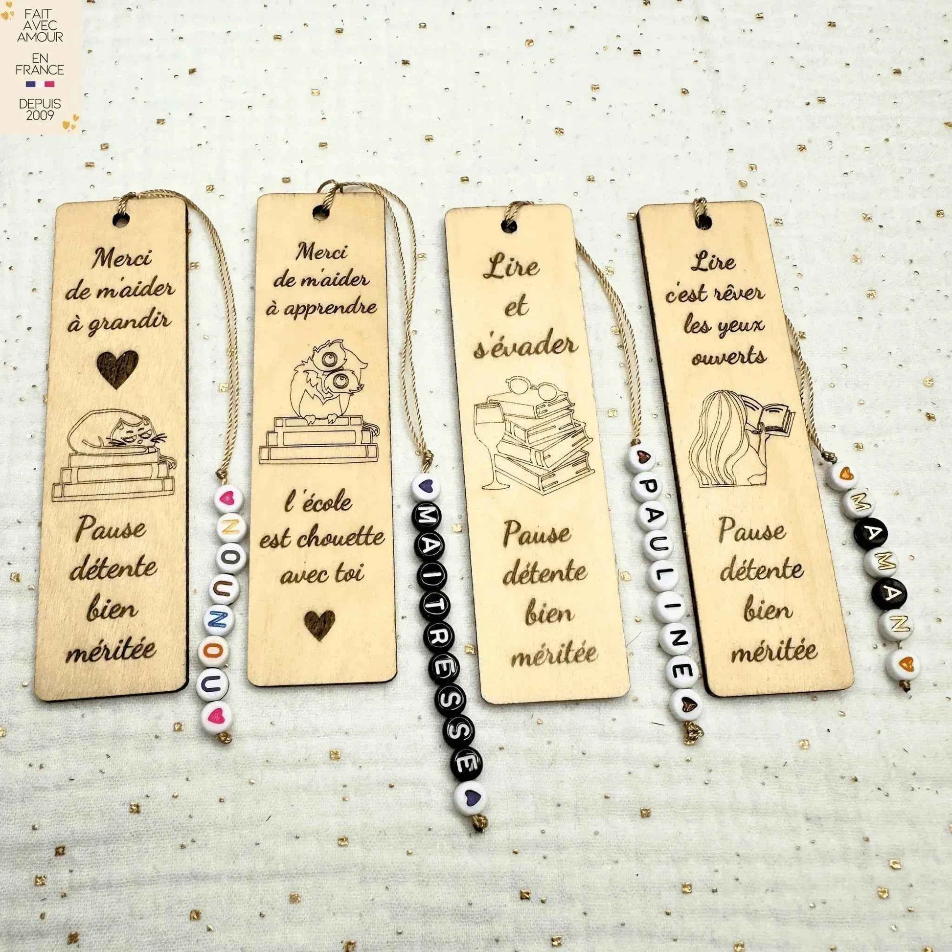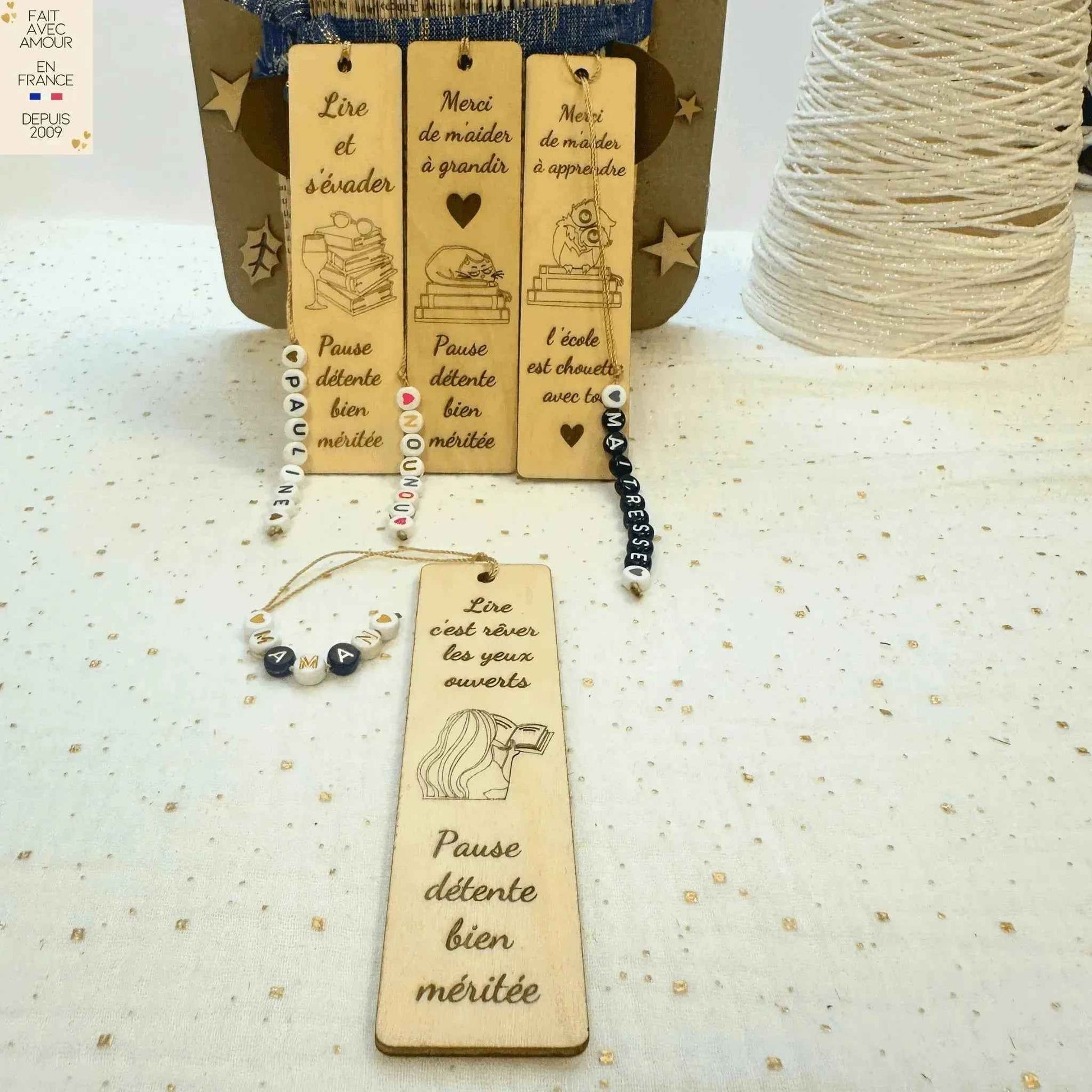 Marque-Page Personnalisé en Bois - Gravure Unique - Perles Lettre et Coeur - Cadeau Français