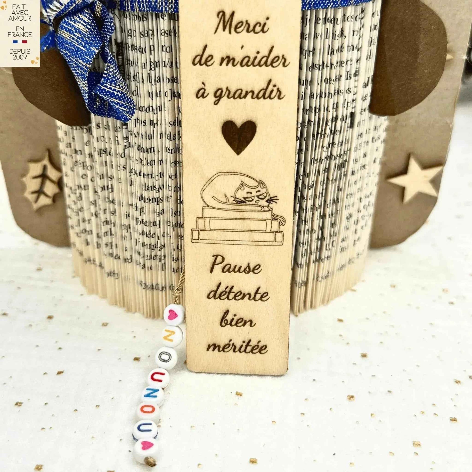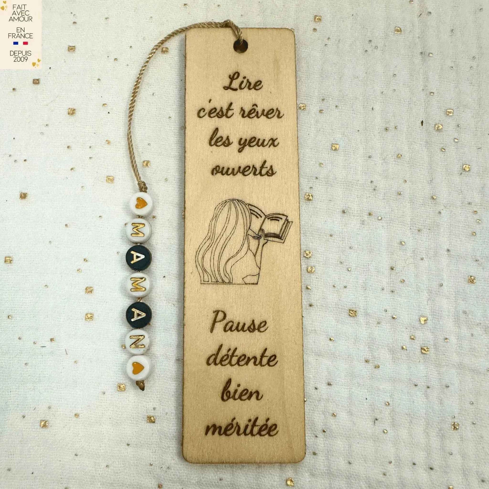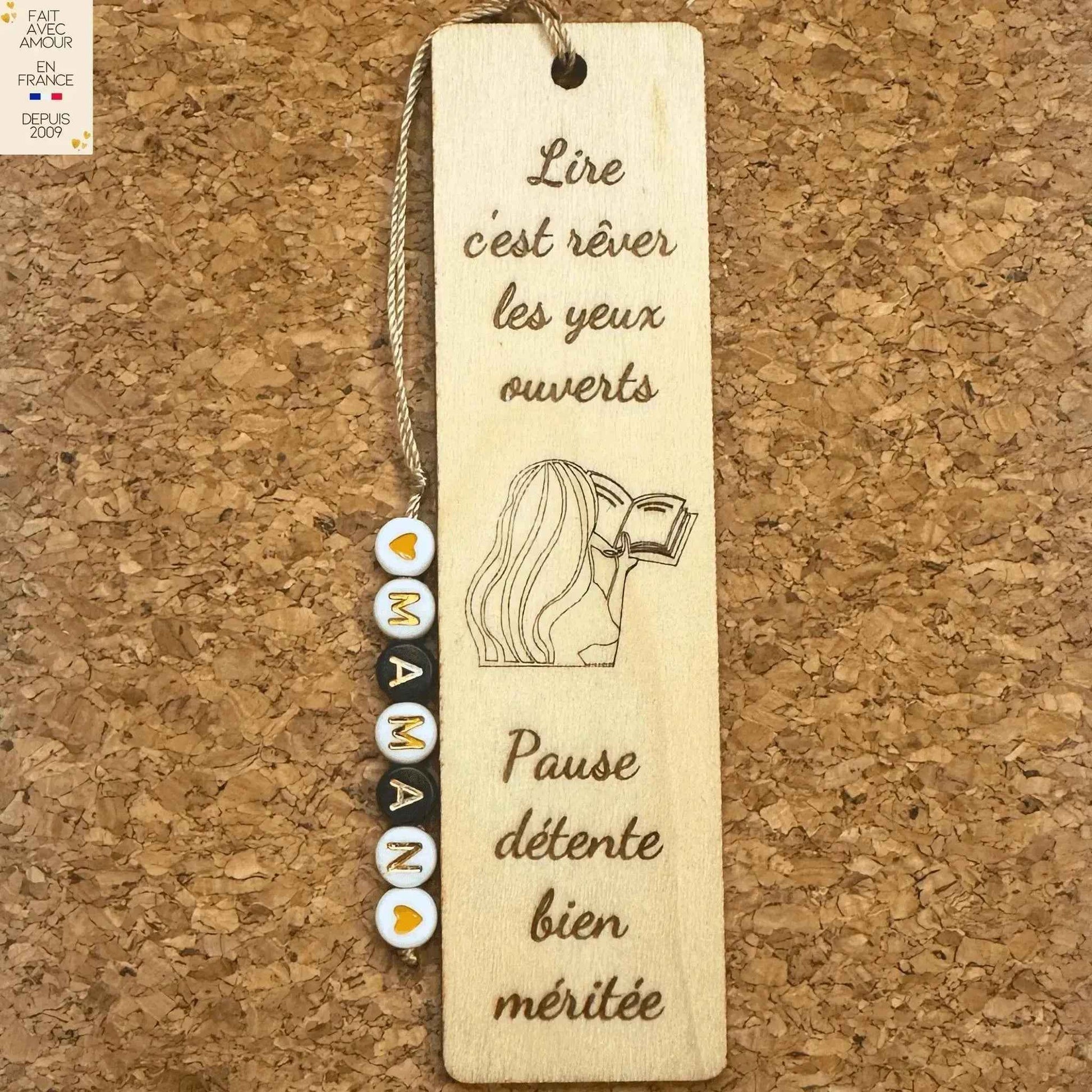 Marque-Page Personnalisé en Bois - Gravure Unique - Perles Lettre et Coeur - Cadeau Français