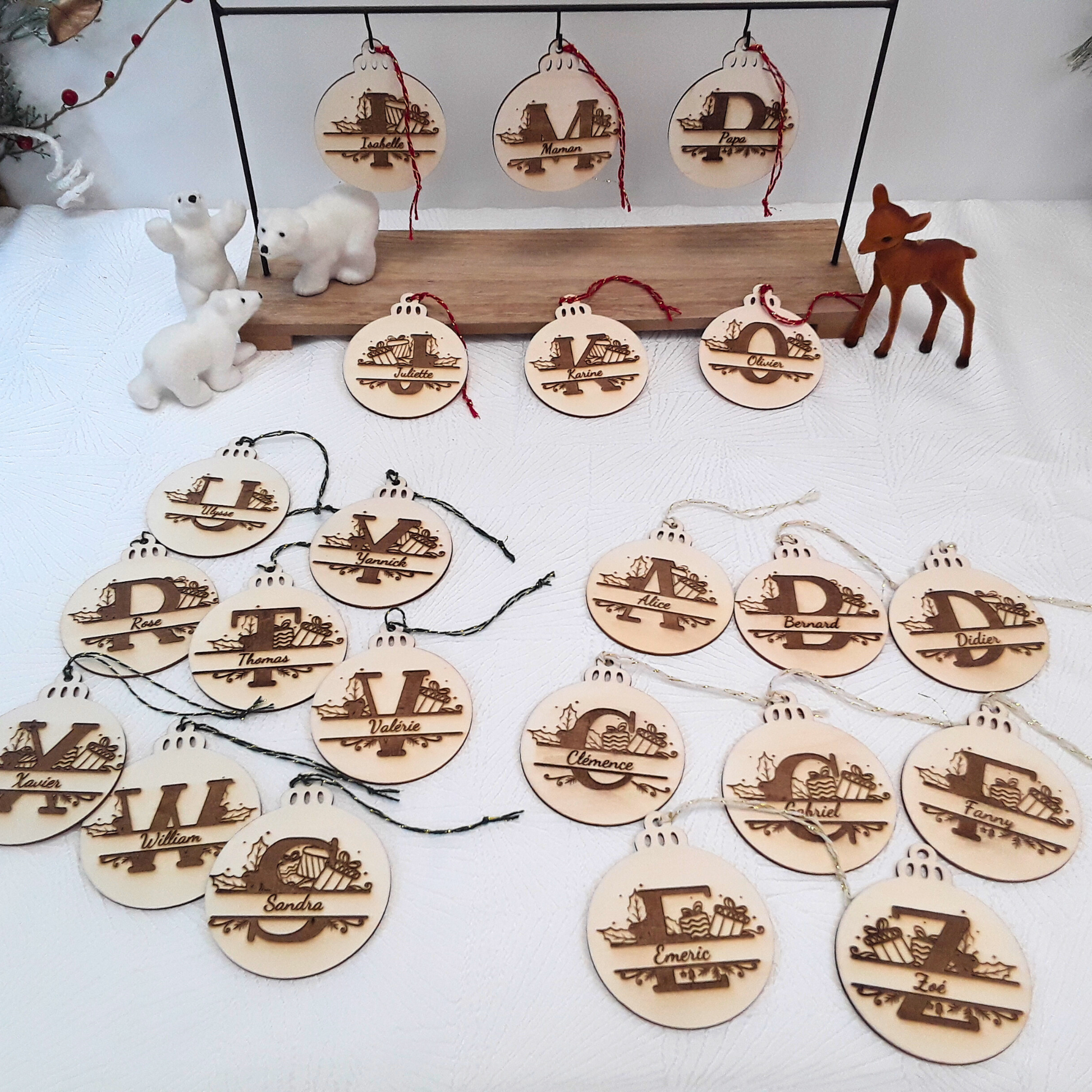 Boule de Noël personnalisée en bois - Initiale et Prénom - Cadeau artisanal gravé au laser