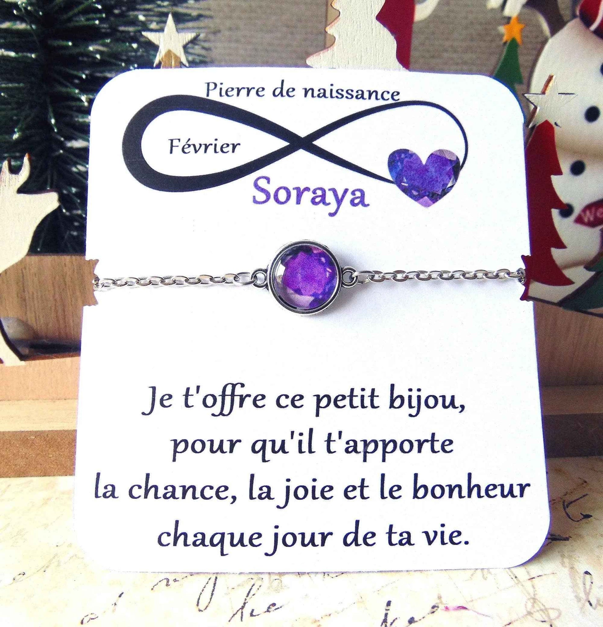Bracelet Pierre de naissance Févier (Améthyste) _ Bracelet chaine en acier inoxydable, carte personnalisable prénom et texte