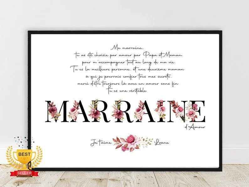 Cadeau pour marraine, voici une affiche avec texte personnalisable qui pourra convenir pour un joli cadeau de dernière minute et à petit prix