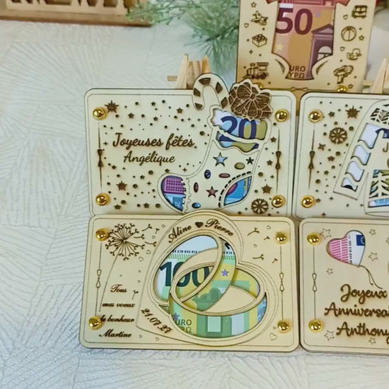 Carte cadeau bois Noël – Gravure artisanale – Présentation billet élégante – Cadeau original, étrenne, remerciement